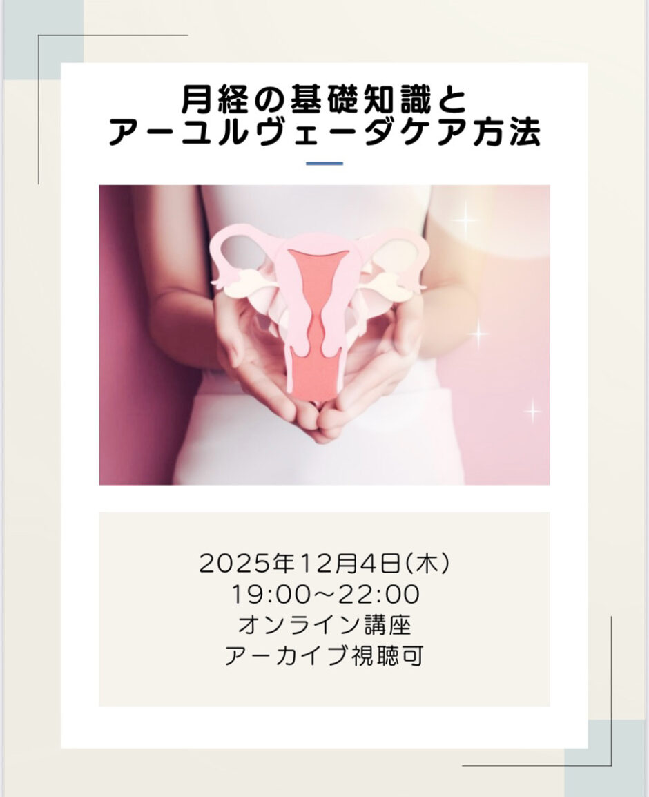 🔸アーユルヴェーダにおける、月経や更年期の理解、月経期間中の過ごし方や、女性のためのアーユルヴェーダケアを遠田がお話しします。